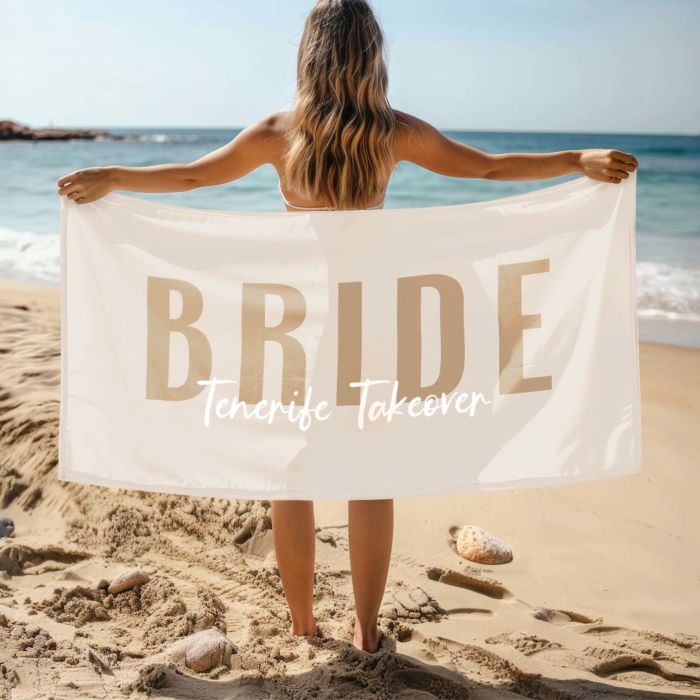 Wer braucht schon ein normales Handtuch, wenn man sein eigenes mit Text haben kann? Schreib drauf, was du willst: „Team Braut“, „Sonnenanbeter 3000“ oder einfach „Nicht anfassen“.